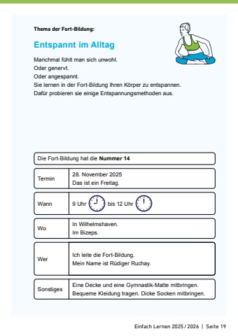 Einfach Lernen 2025/2026 | Seite 19Thema der Fort-Bildung:Entspannt im AlltagManchmal f%u00fchlt man sich unwohl.Oder genervt.Oder angespannt.Sie lernen in der Fort-Bildung Ihren K%u00f6rper zu entspannen.Daf%u00fcr probieren sie einige Entspannungsmethoden aus.Die Fort-Bildung hat die Nummer 14Eine Decke und eine Gymnastik-Matte mitbringen.Bequeme Kleidung tragen. Dicke Socken mitbringen. Sonstiges28. November 2025Das ist ein Freitag.TerminIn Wilhelmshaven.Im Bizeps.WoWann 9 Uhr bis 12 Uhr Wer Ich leite die Fort-Bildung.Mein Name ist R%u00fcdiger Ruchay.
