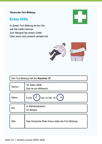 Seite 32 | Einfach Lernen 2025/2026Thema der Fort-Bildung:Erste HilfeIn dieser Fort-Bildung lernen Sie,wie Sie helfen k%u00f6nnen.Zum Beispiel bei einem Unfall.Oder wenn sich jemand verletzt hat.Die Fort-Bildung hat die Nummer 2718. M%u00e4rz 2026Das ist ein Mittwoch.TerminIn Wilhelmshaven.Im Bizeps. WoWann 9 Uhr bis 14 Uhr 15 Wer Das Deutsche Rote Kreuz leitet die Fort-Bildung.