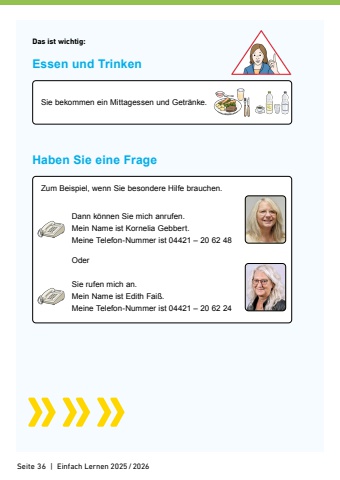 Das ist wichtig:Essen und TrinkenHaben Sie eine FrageZum Beispiel, wenn Sie besondere Hilfe brauchen. Dann k%u00f6nnen Sie mich anrufen.Mein Name ist Kornelia Gebbert.Meine Telefon-Nummer ist 04421 %u2013 20 62 48OderSie rufen mich an.Mein Name ist Edith Fai%u00df. Meine Telefon-Nummer ist 04421 %u2013 20 62 24Sie bekommen ein Mittagessen und Getr%u00e4nke.Seite 36 | Einfach Lernen 2025/2026