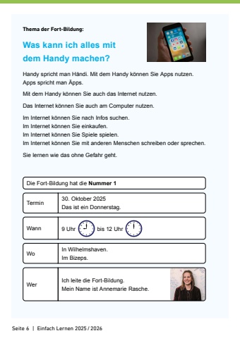 Seite 6 | Einfach Lernen 2025/2026Thema der Fort-Bildung:Was kann ich alles mit dem Handy machen?Handy spricht man H%u00e4ndi. Mit dem Handy k%u00f6nnen Sie Apps nutzen. Apps spricht man %u00c4pps. Mit dem Handy k%u00f6nnen Sie auch das Internet nutzen.Das Internet k%u00f6nnen Sie auch am Computer nutzen.Im Internet k%u00f6nnen Sie nach Infos suchen. Im Internet k%u00f6nnen Sie einkaufen.Im Internet k%u00f6nnen Sie Spiele spielen.Im Internet k%u00f6nnen Sie mit anderen Menschen schreiben oder sprechen.Sie lernen wie das ohne Gefahr geht.Die Fort-Bildung hat die Nummer 130. Oktober 2025Das ist ein Donnerstag.TerminIn Wilhelmshaven. Im Bizeps. WoWann 9 Uhr bis 12 Uhr Wer Ich leite die Fort-Bildung.Mein Name ist Annemarie Rasche.