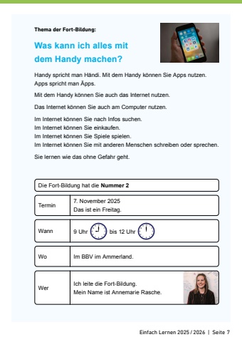 Einfach Lernen 2025/2026 | Seite 7Thema der Fort-Bildung:Was kann ich alles mit dem Handy machen?Handy spricht man H%u00e4ndi. Mit dem Handy k%u00f6nnen Sie Apps nutzen. Apps spricht man %u00c4pps. Mit dem Handy k%u00f6nnen Sie auch das Internet nutzen.Das Internet k%u00f6nnen Sie auch am Computer nutzen.Im Internet k%u00f6nnen Sie nach Infos suchen. Im Internet k%u00f6nnen Sie einkaufen.Im Internet k%u00f6nnen Sie Spiele spielen.Im Internet k%u00f6nnen Sie mit anderen Menschen schreiben oder sprechen.Sie lernen wie das ohne Gefahr geht.Die Fort-Bildung hat die Nummer 27. November 2025Das ist ein Freitag.TerminWo Im BBV im Ammerland.Wann 9 Uhr bis 12 Uhr Wer Ich leite die Fort-Bildung.Mein Name ist Annemarie Rasche.