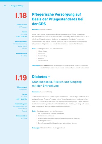 20 I. P%u00e4dagogik & PflegePflegerische Versorgung auf Basis der Pflegestandards bei der GPSReferentin: Yvonne Ro%u00dfkampImmer mehr Nutzer*innen unserer Einrichtungen sind auf Pflege angewiesen, die von den Mitarbeiter*innen teilweise oder vollst%u00e4ndig %u00fcbernommen werden muss. Mit diesen Pflegesituationen sind neue p%u00e4dagogische Mitarbeiter*innen nicht unbedingt vertraut. Dieses Seminar vermittelt die am h%u00e4ufigsten vorkommenden pflegerischen T%u00e4tigkeiten und erl%u00e4utert diese anhand praktischer Beispiele.Ziele: Grundlagenwissen aus den Bereichen: K%u00f6rperpflege Ern%u00e4hrung Ausscheidung Mobilit%u00e4t DokumentationZielgruppe: Pflichtseminar f%u00fcr neue p%u00e4dagogische Mitarbeiter*innen aus dem Bereich Wohnen, andere Interessierte sind ebenfalls herzlich willkommen.Diabetes %u2013 Krankheitsbild, Risiken und Umgang mit der ErkrankungReferentin: Yvonne Ro%u00dfkampDiabetes mellitus ist eine der h%u00e4ufigsten chronischen Erkrankungen weltweit %u2013 mit stetig steigender Tendenz. Trotz der hohen Verbreitung bestehen oft Unklarheiten %u00fcber die Ursachen, Risikofaktoren und Behandlungsm%u00f6glichkeiten. Dieses Seminar bietet eine Einf%u00fchrung in das Krankheitsbild Diabetes mellitus, und zeigt auf, wie ein guter Umgang mit der Erkrankung im Alltag m%u00f6glich ist.Ziele: Grundlagenwissen aus den Bereichen: das Krankheitsbild Diabetes verstehen Risikofaktoren erkennen praktische Handlungskompetenz f%u00fcr den Umgang mit Diabetes im Alltag entwickeln Betroffene empathisch begleiten und unterst%u00fctzen k%u00f6nnenZielgruppe: Mitarbeiter*innen im GruppendienstI.18Teilnehmerzahl12 PersonenTermin25.6.20269.00 - 12.00 UhrVeranstaltungsortFortbildungszentrum,Banter Weg 9, Raum 6Anmeldeschluss25.5.2026I.19Teilnehmerzahl16 PersonenTermin8.5.20269.00 - 12.00 UhrVeranstaltungsortFortbildungszentrum,Banter Weg 9, Raum 4Anmeldeschluss8.4.2026