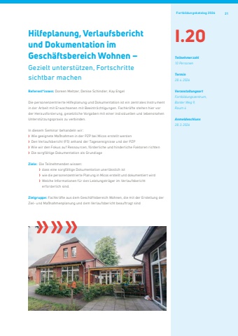 Fortbildungskatalog 2026 21Hilfeplanung, Verlaufsbericht und Dokumentation im Gesch%u00e4ftsbereich Wohnen %u2013 Gezielt unterst%u00fctzen, Fortschritte sichtbar machenReferent*innen: Doreen Meltzer, Denise Schindler, Kay EngelDie personenzentrierte Hilfeplanung und Dokumentation ist ein zentrales Instrument in der Arbeit mit Erwachsenen mit Beeintr%u00e4chtigungen. Fachkr%u00e4fte stehen hier vor der Herausforderung, gesetzliche Vorgaben mit einer individuellen und lebensnahen Unterst%u00fctzungspraxis zu verbinden.In diesem Seminar behandeln wir:Wie geeignete Ma%u00dfnahmen in der PZP bei Micos erstellt werden Den Verlaufsbericht (F5) anhand der Tagesereignisse und der PZP Wie wir den Fokus auf Ressourcen, f%u00f6rderliche und hinderliche Faktoren richten Die sorgf%u00e4ltige Dokumentation als GrundlageZiele: Die Teilnehmenden wissen:dass eine sorgf%u00e4ltige Dokumentation unerl%u00e4sslich ist wie die personenzentrierte Planung in Micos erstellt und dokumentiert wird Welche Informationen f%u00fcr den Leistungstr%u00e4ger im Verlaufsbericht erforderlich sind.Zielgruppe: Fachkr%u00e4fte aus dem Gesch%u00e4ftsbereich Wohnen, die mit der Erstellung der Ziel- und Ma%u00dfnahmenplanung und dem Verlaufsbericht beauftragt sindI.20Teilnehmerzahl10 PersonenTermin28.4.2026VeranstaltungsortFortbildungszentrum,Banter Weg 9, Raum 4 Anmeldeschluss28.3.2026