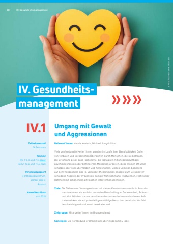 38 IV. GesundheitsmanagementIV. GesundheitsmanagementUmgang mit Gewalt und AggressionenReferent*innen: Hedda Kretsch, Michael Jung-L%u00fcbkeViele professionelle Helfer*innen werden im Laufe ihrer Berufst%u00e4tigkeit Opfer von verbalen und k%u00f6rperlichen %u00dcbergriffen durch Menschen, die sie betreuen. Die Erfahrung zeigt, dass Fachkr%u00e4fte, die tagt%u00e4glich mit pflegebed%u00fcrftigen, psychisch kranken oder behinderten Menschen arbeiten, diese Risiken oft untersch%u00e4tzen oder sich %u00fcberfordert und hilflos f%u00fchlen. Dieses Seminar, basierend auf dem Konzept der piag-b, verbindet theoretisches Wissen (zum Beispiel verschiedene Aspekte der Pr%u00e4vention, soziale Wahrnehmung, Postvention, rechtlicher Rahmen) mit schonenden physischen Interventionstechniken.Ziele: Die Teilnehmer*innen gewinnen mit diesen Kenntnissen sowohl in Ausnahmesituationen als auch im normalen Berufsalltag an Gelassenheit, Pr%u00e4senz und Mut. Mit dem daraus resultierenden authentischen und sicheren Auftreten wirken sie auf potentiell gewaltt%u00e4tige Menschen bereits im Vorfeld beschwichtigend und somit deeskalierend.Zielgruppe: Mitarbeiter*innen im GruppendienstSonstiges: Die Fortbildung erstreckt sich %u00fcber insgesamt 4 Tage.IV.1Teilnehmerzahl16 PersonenTermineTeil 1: 6.5.und 7.5. sowieTeil 2: 10.6.und 11.6.2026VeranstaltungsortFortbildungszentrum,Banter Weg 9, Raum 4Anmeldeschluss6.4.202638 IV. Gesundheitsmanagement%u00a9 Marta Maksymiv %u2013 stock.adobe.com
