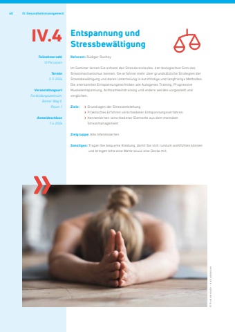 40 IV. GesundheitsmanagementIV.4Teilnehmerzahl12 PersonenTermin5.5.2026VeranstaltungsortFortbildungszentrum,Banter Weg 9, Raum 1Anmeldeschluss7.4.2026Entspannung und Stressbew%u00e4ltigungReferent: R%u00fcdiger RuchayIm Seminar lernen Sie anhand des Stresskreislaufes, den biologischen Sinn des Stressmechanismus kennen. Sie erfahren mehr %u00fcber grunds%u00e4tzliche Strategien der Stressbew%u00e4ltigung und deren Unterteilung in kurzfristige und langfristige Methoden. Die anerkannten Entspannungstechniken wie Autogenes Training, Progressive Muskelentspannung, Achtsamkeitstraining und andere werden vorgestellt und verglichen.Ziele: Grundlagen der StressentstehungPraktisches Erfahren verschiedener EntspannungsverfahrenKennenlernen verschiedener Elemente aus dem mentalen StressmanagementZielgruppe: Alle InteressiertenSonstiges: Tragen Sie bequeme Kleidung, damit Sie sich rundum wohlf%u00fchlen k%u00f6nnen und bringen bitte eine Matte sowie eine Decke mit.%u00a9 Prostock-studio %u2013 stock.adobe.com