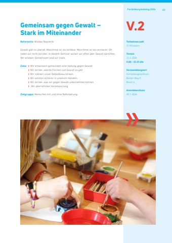 Fortbildungskatalog 2026 43Gemeinsam gegen Gewalt %u2013Stark im MiteinanderReferentin: Wiebke RoprechtGewalt gibt es %u00fcberall. Manchmal ist sie sichtbar. Manchmal ist sie versteckt. Oft reden wir nicht dar%u00fcber. In diesem Seminar wollen wir offen %u00fcber Gewalt sprechen. Wir erleben: Gemeinsam sind wir stark.Ziele: Wir entwickeln gemeinsam eine Haltung gegen Gewalt Wir lernen, welche Formen von Gewalt es gibt Wir st%u00e4rken unser Selbstbewusstsein Wir werden sicherer in unserem Handeln Wir lernen, was wir gegen Gewalt unternehmen k%u00f6nnen Wir %u00fcbernehmen VerantwortungZielgruppe: Menschen mit und ohne Behinderung.V.2Teilnehmerzahl12 PersonenTermin13.2.20269.00 - 12.15 UhrVeranstaltungsortFortbildungszentrum,Banter Weg 9, Raum 4Anmeldeschluss30.1.2026