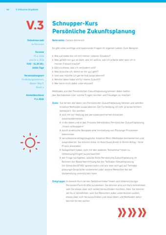 44 V. Inklusive AngeboteSchnupper-Kurs Pers%u00f6nliche ZukunftsplanungReferentin: Carolin EmmrichEs gibt viele wichtige und spannende Fragen im eigenen Leben. Zum Beispiel:Wie zufrieden bin ich mit meiner Lebens-Situation? Was gef%u00e4llt mir gut an dem, wie ich wohne, wie ich arbeite oder was ich in meiner Freizeit mache? Gibt es etwas, das ich ver%u00e4ndern will? Was brauche ich, damit es mir gut geht? Und was m%u00f6chte ich gerne mal ausprobieren?Welche Ideen habe ich f%u00fcr meine Zukunft?Wer kann mich dabei unterst%u00fctzen?Methoden aus der Pers%u00f6nlichen Zukunftsplanung k%u00f6nnen dabei helfen, das Nachdenken %u00fcber solche Fragen leichter und freudiger zu machenZiele: Sie lernen die Ideen von Pers%u00f6nlicher Zukunftsplanung kennen und werden kreative Methoden ausprobieren. Die Fortbildung ist sehr praxisorientiert konzipiert. Sie werden:sich mit der Haltung des personenzentrierten Ansatzes auseinandersetzenin die Ideen und in das Prozess-Verst%u00e4ndnis Pers%u00f6nlicher Zukunftsplanung %u201ehinein schnuppern%u201c durch praktische Beispiele eine Vorstellung von Planungs-Prozessen bekommenverschiedene alltagstaugliche, kreative (Mini-)Methoden kennenlernen und ausprobieren. Sie k%u00f6nnen diese im Anschluss direkt in Ihrem Alltag / Ihrer Praxis anwendenGelegenheit haben, sich mit den anderen Teilnehmer*innen zu Umsetzungsfragen auszutauschender Frage nachgehen, welche Rolle Pers%u00f6nliche Zukunftsplanung im Rahmen der Bedarfsermittlung bei der Teilhabe-/Gesamtplanung (im Sinne des BTHG) spielen kann und wie man sich gut auf Teilhabeplanungs-Gespr%u00e4che vorbereiten oder andere Menschen bei der Vorbereitung unterst%u00fctzen kannZielgruppe: In diesem Kurs lernen Selbstvertreter*innen und Unterst%u00fctzungsPersonen/Fach-Kr%u00e4fte zusammen. Sie k%u00f6nnen also am Kurs teilnehmen, weil Sie etwas %u00fcber sich selbst herausfinden m%u00f6chten. Oder Sie k%u00f6nnenam Kurs teilnehmen, weil Sie Menschen dabei unterst%u00fctzen wollen, etwas %u00fcber sich herauszufinden und neue Ideen und Methoden daf%u00fcr kennen lernen wollen.V.3Teilnehmerzahl16 PersonenTermine25.6.2026und 26.6.20269.00 - 16.30 Uhr, beide TageVeranstaltungsortFortbildungszentrum,Banter Weg 9, Raum 4Anmeldeschluss9.4.2026