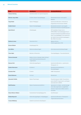 Name Qualifikation ZusatzqualifikationenThomas Hartwig Fachinformatiker f%u00fcr SystemintegrationMichael Jung-L%u00fcbke Erzieher, Diplom-Sozialp%u00e4dagoge Deeskalationstrainer nach piag-B, MediatorTanja Kiefer Diplom-P%u00e4dagogin Systemische Beraterin, Fachkraft f%u00fcr tiergest%u00fctzte Interventionen (ISAAT)Hedda Kretsch Diplom-Sozialp%u00e4dagogin Deeskalationstrainerin nach piag-B,Systemische Familien-Sozialtherapeutin Anja Kuhnert Heilp%u00e4dagogin VHT Ausbilderin/Supervisorin (SPIN-DGVB), Traumap%u00e4dagogik/Traumzentrierte Fachberatung (DeGPT/Fachverband Traumap%u00e4dagogik, Fach-Referentin der GesUK, Kommunikationsp%u00e4dagogin i. Wb. (FBZ-UK Uni K%u00f6ln)Edeltraut Leiner Historikerin M.A. Qigong-Lehrerin, Ern%u00e4hrungsberaterin TCMDoreen Meltzer Heilp%u00e4dagogin B.A. Uwe M%u00fcller Datenschutzbeauftragter InformationssicherheitsbeauftragterThore Opitz Bachelor of Education Traumap%u00e4dagoge u. TraumafachberaterTheresa Orzessek Master of Arts in Sozialer Arbeit; Schwerpunkt Sozialraumentwicklung und -organisationRamona Perl Heilerziehungspflegerin Systemische Beraterin u. systemische Therapeutin i.A.Sandra Petermann Erzieherin Gewaltschutzmultiplikatorin, Sexualp%u00e4dagoginChristian Pohl Erzieher HMB-T MultiplikatorDaniel Rahmann Fa. Krull BrandschutzAlexandra Puttlitz Diplom-Psychologin Psychotherapeutin (HpG), Traumatherapeutin (DeGPT), Supervisorin und Organisationsberaterin (DGSV)Steffi Rambau Diplom-Sozialwissenschaftlerin Spezialistin f%u00fcr Selbst- und Zeitmanagement, B%u00fcroorganisation, ausgebildete Trainerin, Supervisorin DGSv, Coach & CounselorSimon Richarz-H%u00fcbner Sozialarbeiter/Sozialp%u00e4dagoge M.A. SuchttherapeutWiebke Roprecht Heilerziehungspflegerin, Heilp%u00e4dagogin Systemische Beraterin/-Therapeutin/-OrganisationsentwicklerinYvonne Ro%u00dfkamp Staatlich examinierte Alenpflegerin52 Referent*innenliste