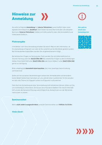 Hinweise zur Anmeldung Hinweise zu Anmeldung 55Hier geht es direkt zum Anmeldeportal:Hinweise zur AnmeldungAb sofort erfolgt die Anmeldung f%u00fcr interne Teilnehmer, ausschlie%u00dflich %u00fcber unser digitales Anmeldeportal %u201eSemPlan%u201c. Dort finden Sie eine %u00dcbersicht %u00fcber alle aktuellen Seminare. Externe Teilnehmer melden sich bitte weiterhin %u00fcber das Anmeldeformular (siehe letzte Seite) an.PlatzvergabeUnmittelbar nach Ihrer Anmeldung erhalten Sie eine E-Mail mit der Information, ob Ihre Anmeldung erfolgreich war oder ob Sie zun%u00e4chst auf die Warteliste gesetzt wurden. Bei freiwerdenden Kapazit%u00e4ten werden Sie umgehend benachrichtigt. Bei technischen Fragen zur Nutzung des Tools wenden Sie sich bitte telefonisch an Thomas Hartwig unter der 04421/206-258. Bei inhaltlichen Fragen zu den Fortbildungen stehen Ihnen Edith Fai%u00df unter 04421/206-224 oder Konni Gebbert unter 04421/206-248gerne zur Verf%u00fcgung. Bitte unbedingt die Anmeldefristen beachten, die in der jeweiligen Ausschreibung vermerkt sind. Sollte sich bei einzelnen Veranstaltungen anhand der Anmeldezahlen ein besonders hoher Bedarf abzeichnen, bem%u00fchen wir uns, zeitnah einen zus%u00e4tzlichen Termin anzubieten bzw. das Thema im Folgejahr erneut ins Programm aufzunehmen.Falls Sie trotz Anmeldung an einer Veranstaltung nicht teilnehmen k%u00f6nnen, bitten wir Sie, uns rechtzeitig zu informieren. Ein kurzer Anruf bei Konni Gebbert (Tel. 04421/206-248) hilft uns bei der besseren Planung und erm%u00f6glicht es, Kolleg*innen von der Warteliste nachr%u00fccken zu lassen.SeminarzeitenWenn nicht anders ausgeschrieben, sind die Seminarzeiten von 9.00 bis 16.15 Uhr.Vielen Dank!55